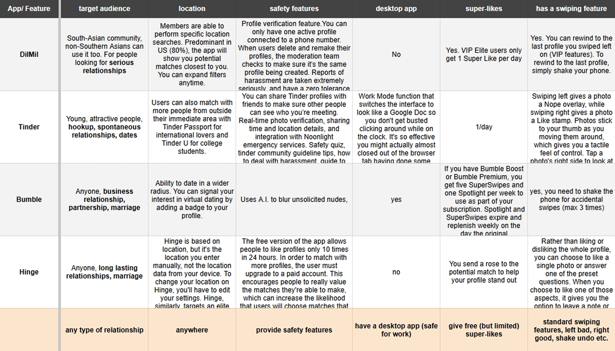Screenshot of an analysis comparing DilMil, Tinder, Bumble, and Hinge across various features such as target audience, safety features, monetization, user base, integrations, chat options, etc.